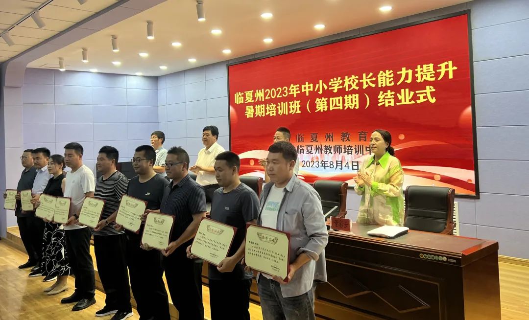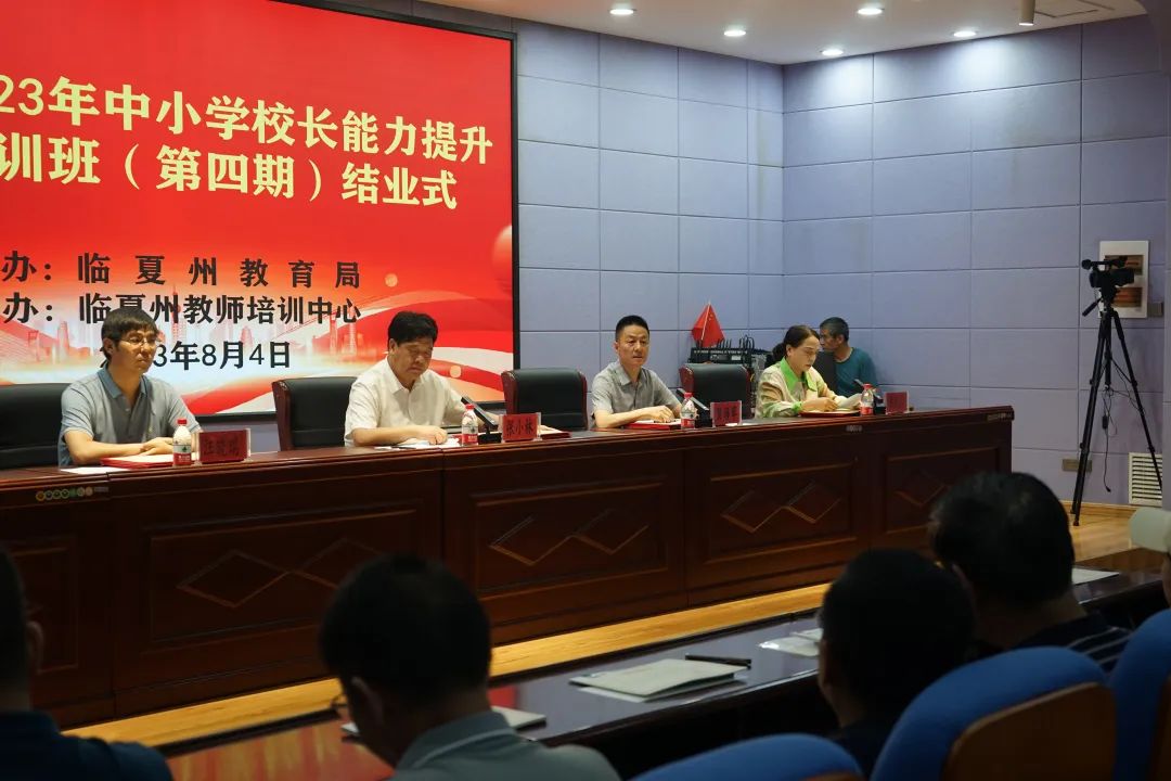 8月4日下午,临夏州2023年中小学校长能力提升暑期培训班(第四期)学员进行完培训监测后,圆满完成本次培训各项任务顺利结业,结业式在临夏州教师培训中心报告厅举行。州教师培训中心主任贠海军主持了第四期培训学员结业仪式,州教育局党组书记、局长张小林出席仪式并讲话,州教师培训中心副主任董彩云宣读第四期优秀学员名单,并为优秀学员颁发了荣誉证书,同时也为所有参训学员发放了培训结业证书。