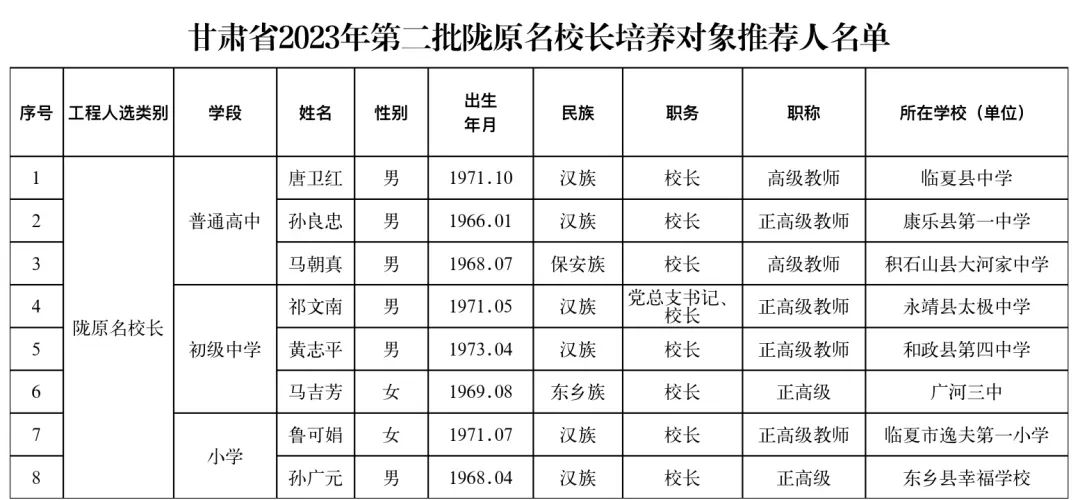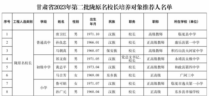 附件:甘肃省2023年第二批陇原名校长培养对象推荐 人名单