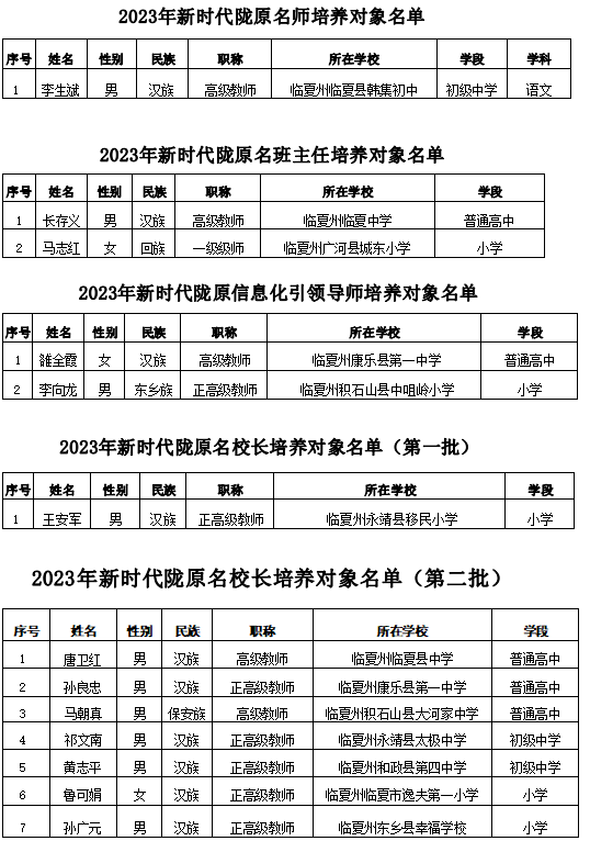 为进一步加强新时代高素质教师、班主任、校长队伍建设,完善整体规划、梯队培育、协同发展的省市县校四级培养机制,促进教育改革与发展,2023 年省教育厅启动实施新时代陇原名师名班主任名校长信息化引领导师建设工程(以下简称“四名工程”),并列入 2023 年省教育厅重点工作任务“十大工程”。按照“学校申报、县区推荐、市州评审、省级认定”的工作原则,省教育厅组织对申报人选进行了评选认定、资格复审、会议研究、网络公示和认定。临夏州13人被认定为“四名工程”培养对象,其中李生斌为新时代陇原名师培养对象,长存义、马志红为新时代陇原名班主任培养对象,雒全霞、李向龙为新时代陇原信息化引领导师培养对象,王安军等8人为新时代陇原名校长培养对象(分两批认定)。