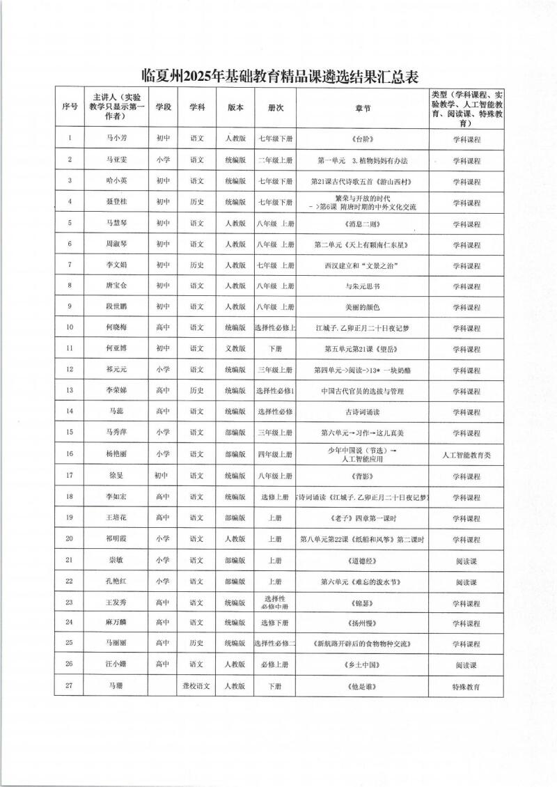 附件:临夏州2025年基础教育精品课遴选结果汇总表