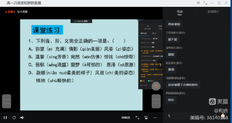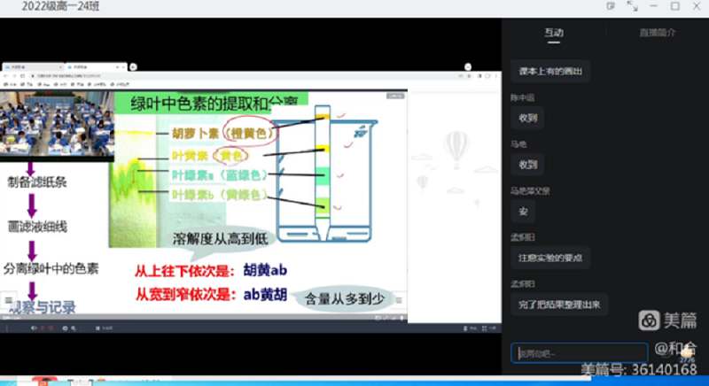 线上课堂中,老师们采用屏幕及时回复、连麦语音互动、即时签到等功能,师生之间充分交流,学生积极参与课堂活动。每位任课教师时刻关注学生课堂参与情况,及时与班主任、家长沟通。课后,教师布置针对性作业,巩固学习,夯实基础,做到有布置、有检查、有反馈。学生们按时参加在线课堂,认真听课,与老师网上互动交流。网课上,一样的课表,不一样的课堂,同学们在线听课,及时交流,答疑反馈,老师们按照“先学后教,当堂检测”模式帮助了学生理解知识,保障了学习效果和效率。作业布置少而精,保证学生活动时间。同学们的笔记很详细,作业也很认真,希望继续保持学习好习惯,让网课也收获满满。