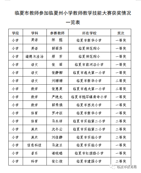 为进一步强化我市教师的教学基本功训练,进一步提升教师教学技能和业务水平,根据《关于举办2023年全州教师教学技能(优质课)大赛暨观摩研讨活动的通知》(临州教研发〔2023〕2号)精神,4月23日至5月12日,临夏市教育局选派16名骨干教师参加了全州小学语文、数学、英语等9门学科的教师教学技能大赛暨观摩研讨活动。