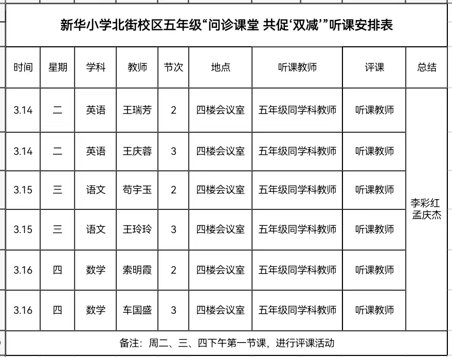 为深入推进学校“三抓三促”行动落地生根,新华小学北街校区五年级组以“抓学习促提升”为发力方向,聚焦教育教学质量提升、教师专业能力强化等重点工作,在双减政策引领下,进一步将“减负提质”落到实处,于3月14日-3月16日,组织开展了“问诊课堂,助力‘双减’”听评课活动。
