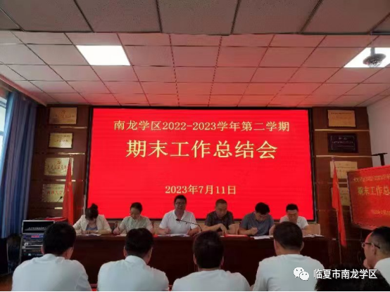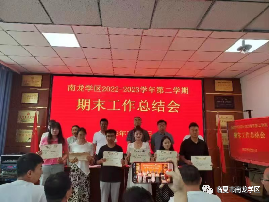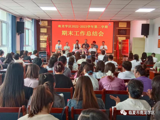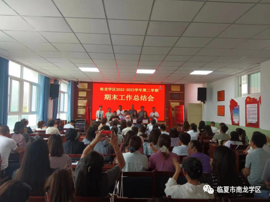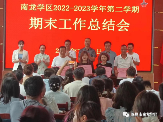 首先,学区党支部书记、区长乔明孔同志代表学区班子做南龙学区2022-2023学年第二学期工作总结。他从党建、教研、德育、安全、工会等几个方面,总结了一学年来学区广大教师所做的工作,肯定了取得的成绩,指出并分析了存在的问题和不足,并对下学年的工作做了安排和部署。其次,学区教研室杨秀芳主任通报了期末学业质量检测成绩,并对各学校任课教师的教学质量进行了认真的分析,提出了针对性的建议。