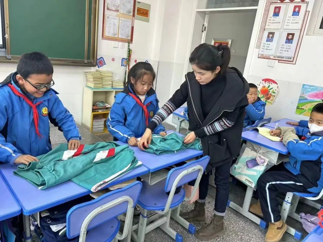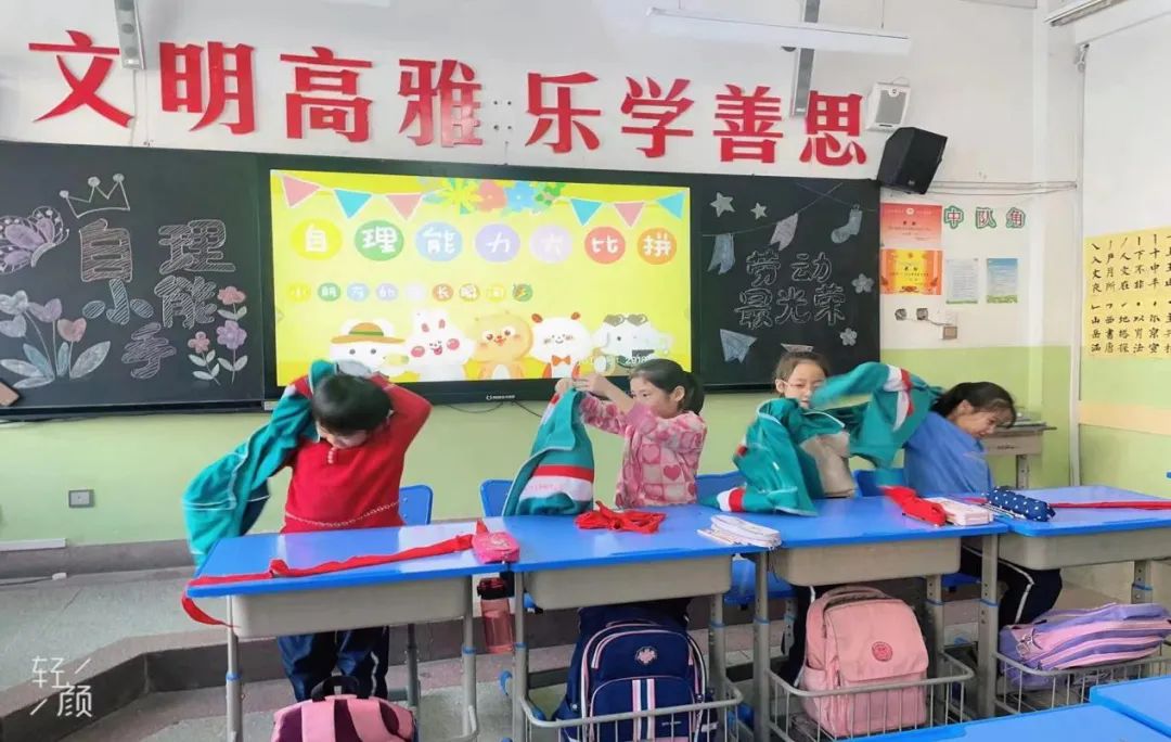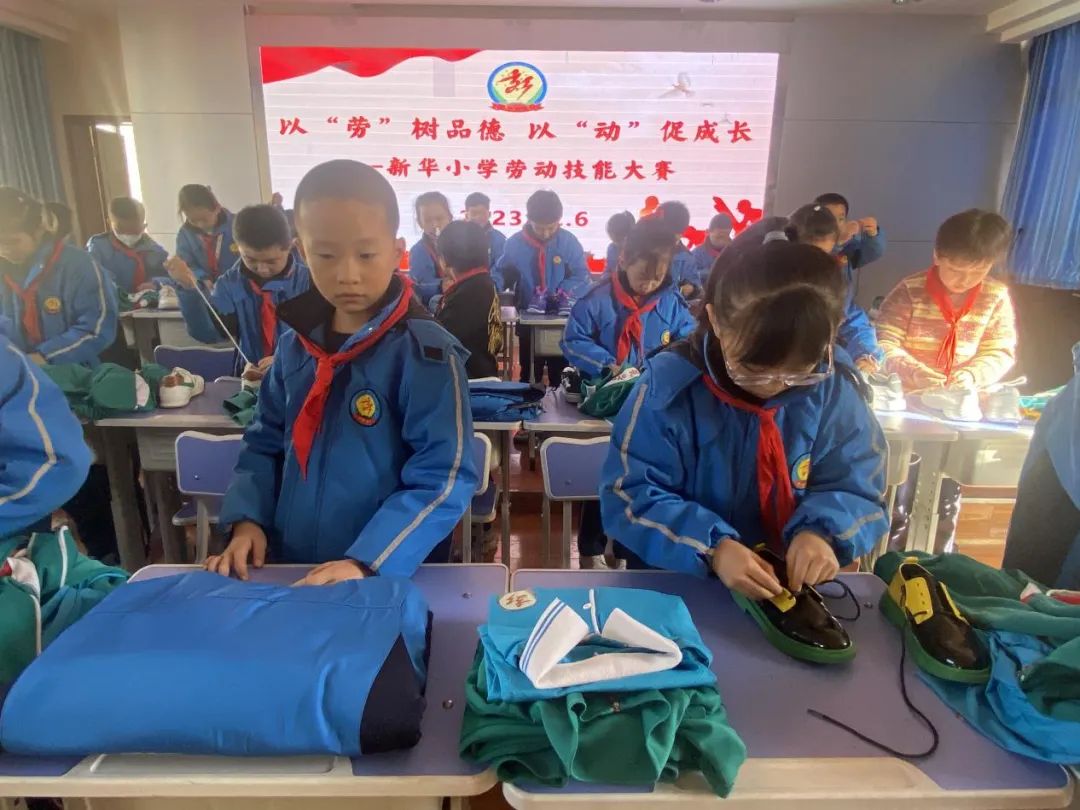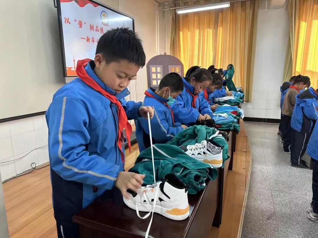 哨声一响,一、二年级的孩子们各个动作娴熟,将课本、练习本和文具盒分类整理,有序地放入书包,竞相展示劳动小能手”的风采。活动结束,看到自己整理好的书包和胸前佩戴规范的红领巾,孩子们都露出了灿烂的笑脸。【三年级】系鞋带 叠衣服鞋带飞快地在鞋带孔里穿梭着,左一搭,右一搭,细长鞋带在一双双“巧手”的牵引下,化身成为一个个美丽又扎实的“蝴蝶结”。叠衣服环节,小选手们动作娴熟,很快就把衣服叠得整齐美观。一只只小手高高举起,脸上绽放出自信的笑容。