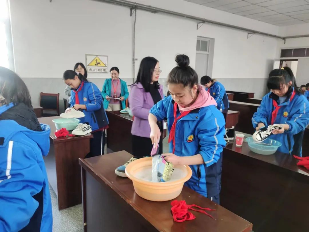 【五年级】自己的事情自己做孩子们用自己的双手,把鲜艳的红领巾清洗干净。在洗鞋子的过程中,孩子们也能够体会到平时父母在家里做家务的辛苦与不易。
