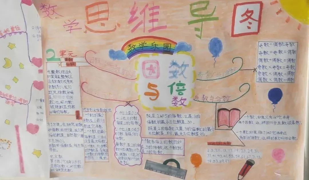 五年级的同学们用课本知识点为准,理清内容重点,剖析知识点的内涵和相互联系,然后将抽象的数学知识具体化、形象化,“画”出个人的数学思维和设计思路。根据自己的理解,同学们展开想象的翅膀,尽情发挥,一幅幅构思精巧、色彩鲜艳、富于创意、充满“数学味”的思维导图,充分展示了孩子们的独特审美和数学素养,堪称一场思维导图的盛宴!