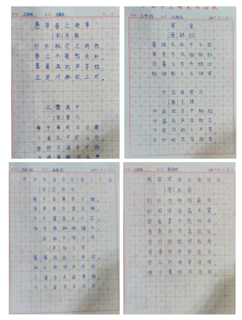 本次活动分低年级组和高年级组进行,针对不同的年级指定了不同的题材,全体参与,学生现场书写,比赛时学生们个个满怀激情,用心书写着每一个笔画、每一个汉字。在短短的45分钟之内,同学们上交了一份份质量优良的作品——书写规范,字迹流畅大方,卷面整洁美观,令人赏心悦目。 经过老师们认真比较筛选,分别评选出了低年级、高年级一二三等,以此鼓励这些同学,同时也激励其他同学向优秀看齐。