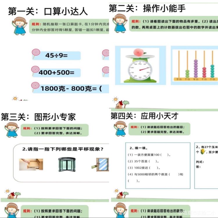 数学学科精心设计了四大关卡,让学生通过动手操作和口头表达等方式展示思维过程与应用技能,引导学生乐学善思,回顾一个学期的收获,体验知识的力量和乐趣。